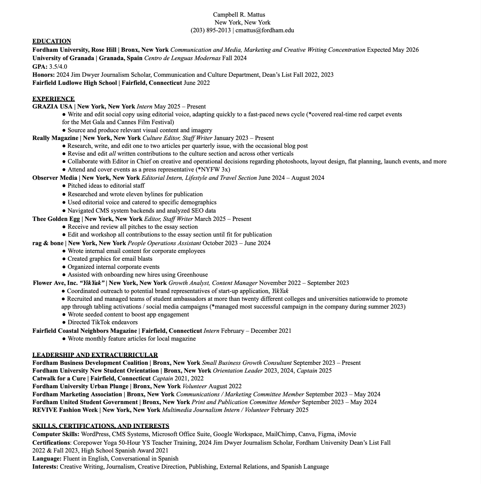 I am a fast learner who works well both individually and in teams. I’ve had to adjust quickly in my professional roles, for instance, taking over as People Operations Assistant at rag & bone in the middle of the semester. Similarly, through my newsroom experience, I’ve learned how to work well under pressure and within time constraints without compromising quality.